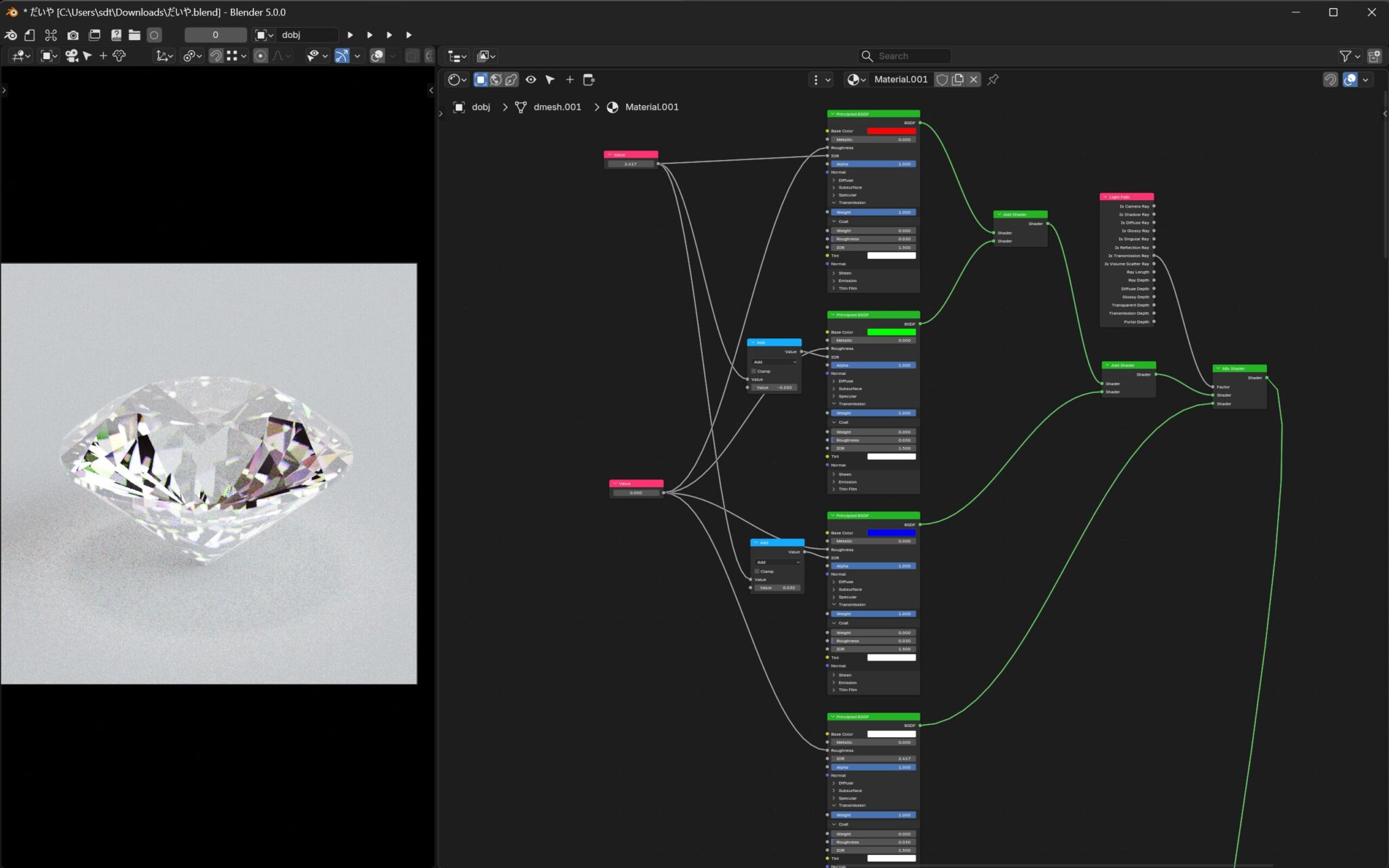ガラスや宝石の色味が、屈折した光の分散によってカラフルに色付く表現の作り方を紹介する。