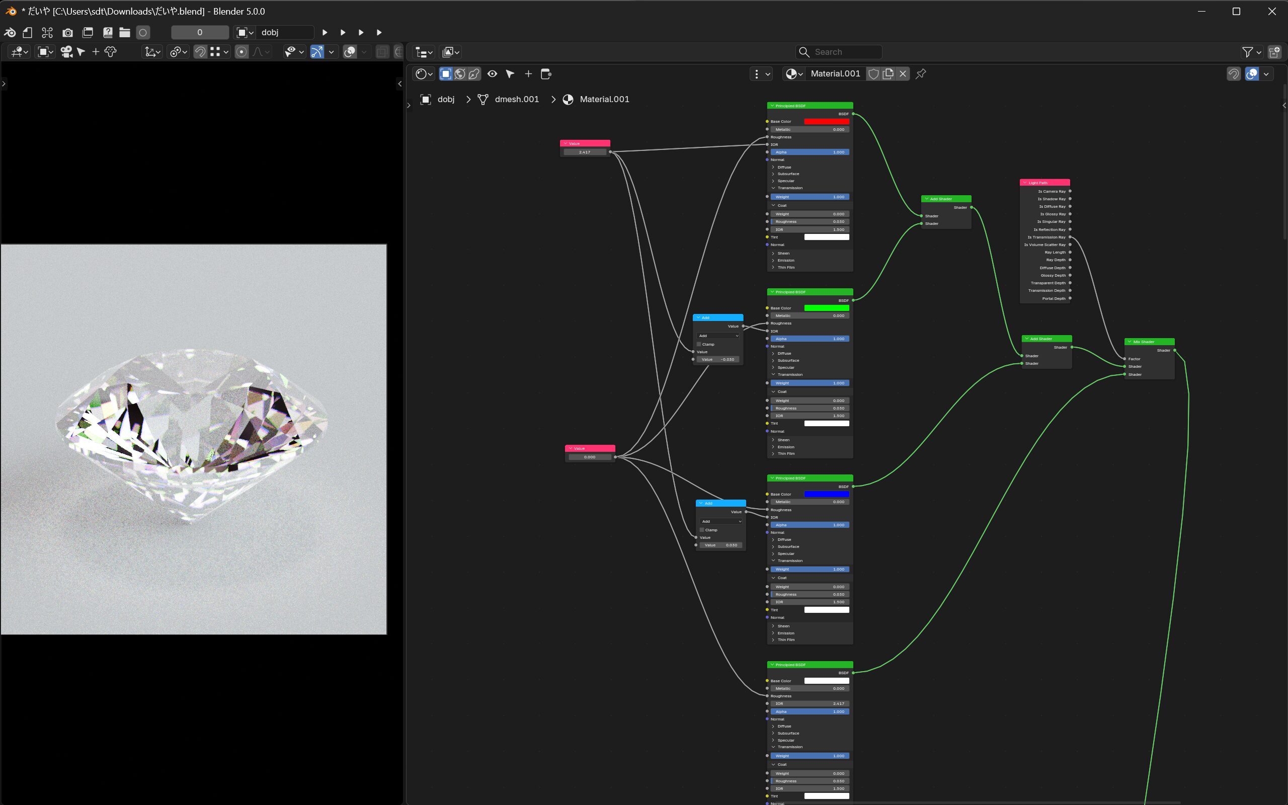 - 値ノードを、フレネルのIORの値にも接続する。