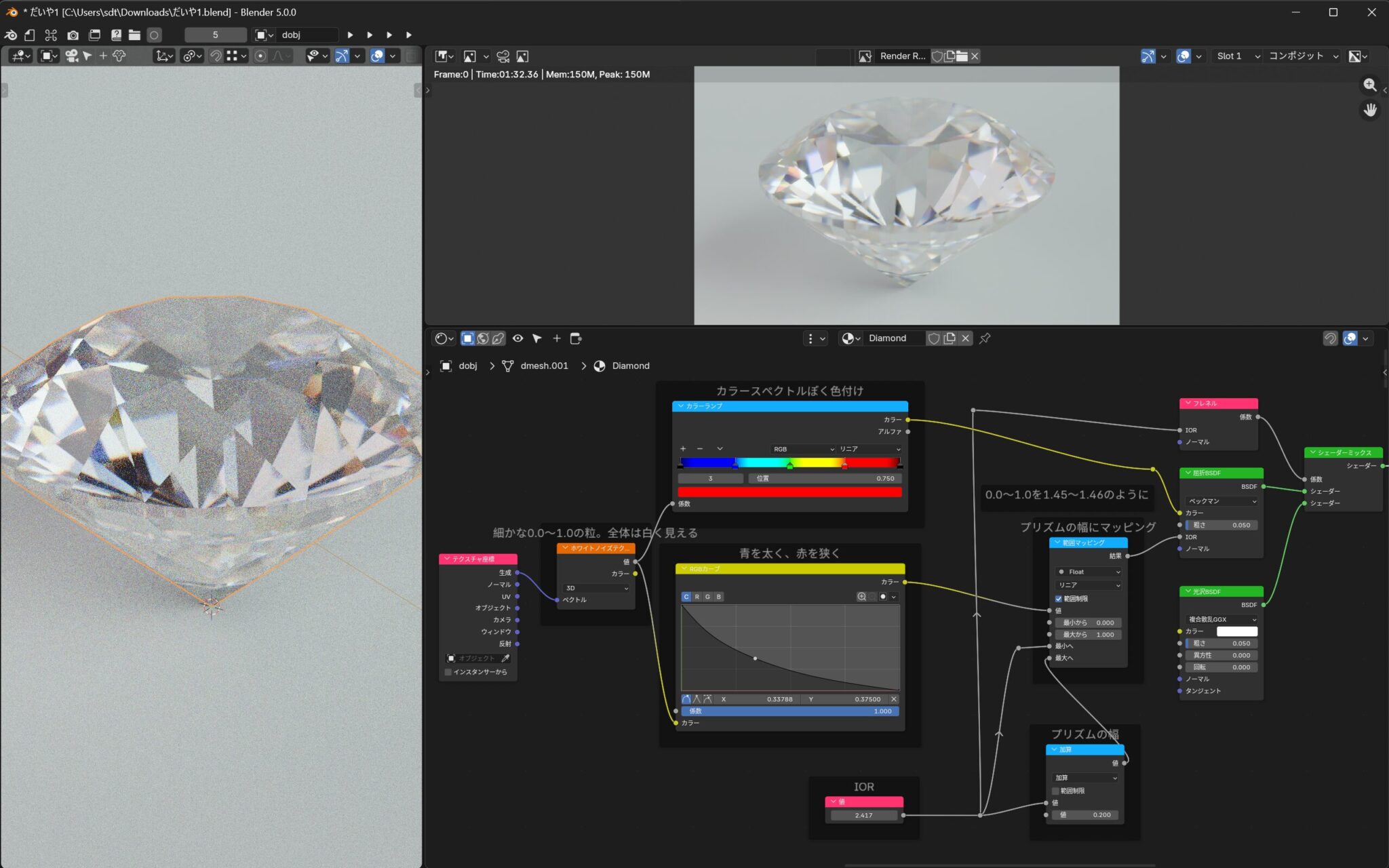 - これにより、ホワイトノイズの粒の範囲(0.0~1.0)を、IOR~プリズムの幅の範囲(1.45~1.46のような)にマッピングする。