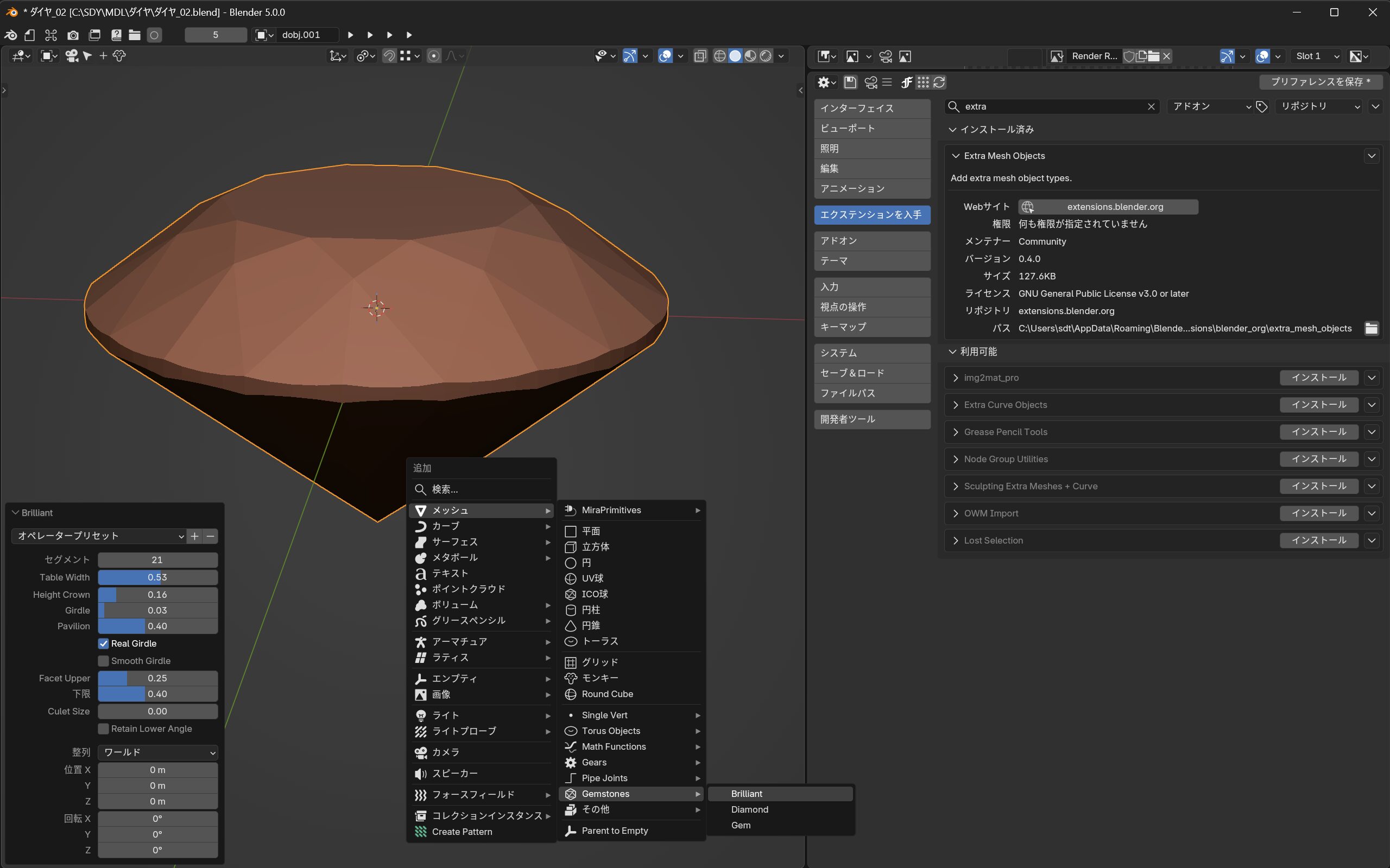 - 3Dビュー > 追加(Shift+A) > メッシュ > Gemstones > Brilliantを作成する。
