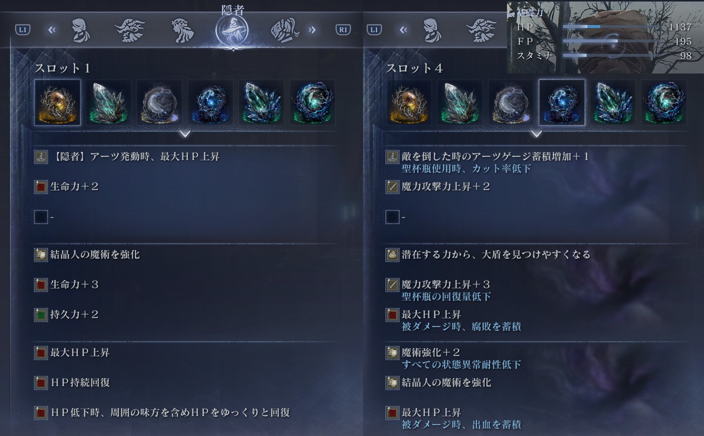 遺物は、「アーツでHP最大値上昇・最大HP上昇x3・常夜マリス・生命+3・敵倒アーツ」などを積む。