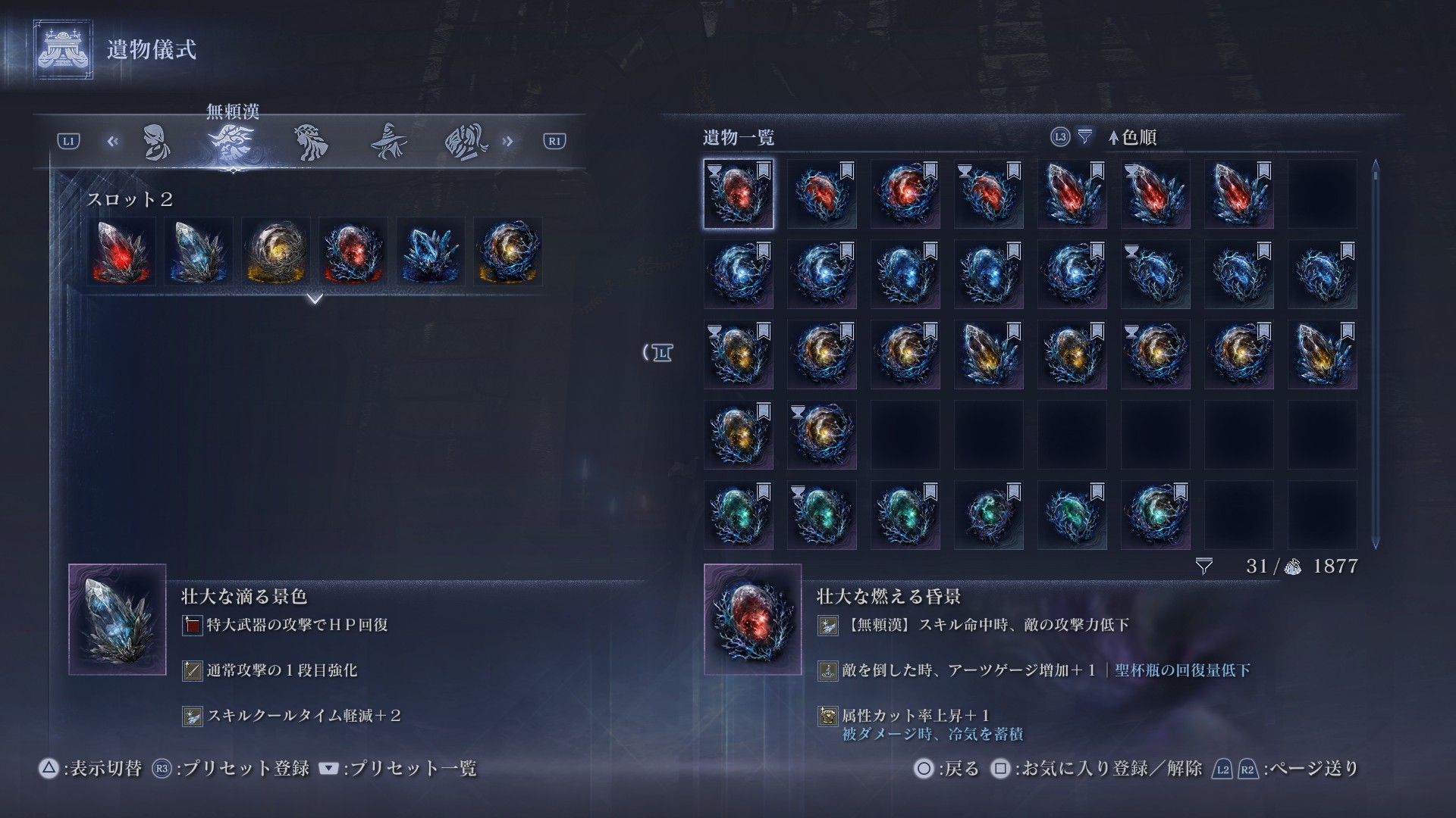色でソートすることで、ダブっている似たような遺物を見つけられる。