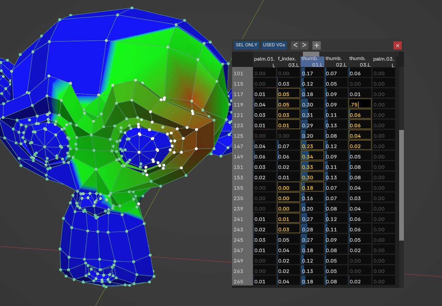 - 単一セルを左右マウスドラッグでウェイト値調整。
